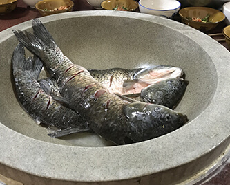 石锅鱼也叫金福鱼,是湘菜中的一道名菜,制作方法是用一块大的花岗岩岩石凿成有双耳的石锅,将鱼放在石锅内烹煎,然后,再加上以辣椒为主的各式佐料,又再加上一些滋补药材制成。